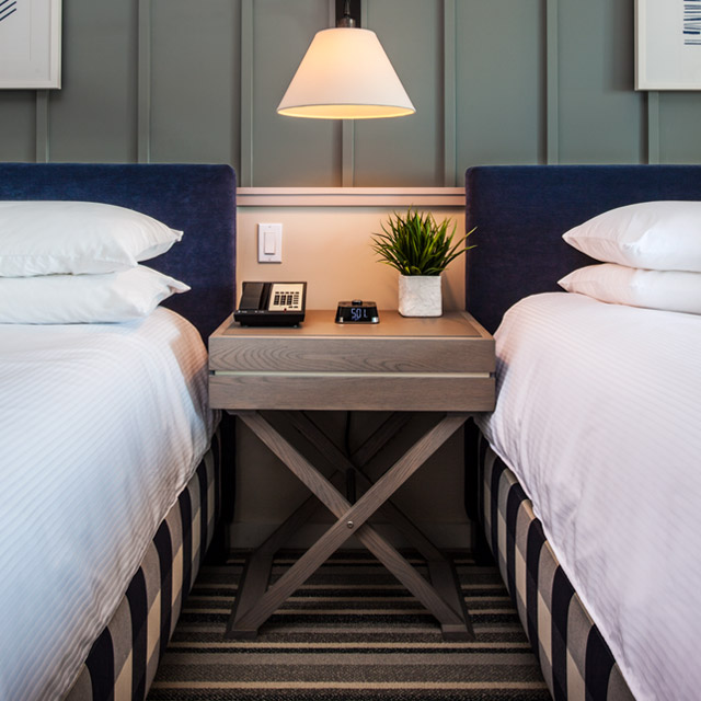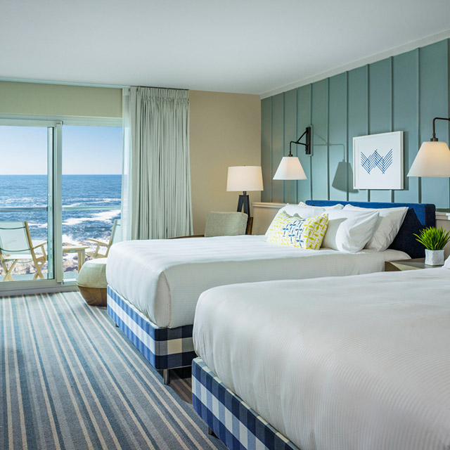 Elegantly simple guest rooms with two king-sized beds, private balconies and views of the Maine coastline.