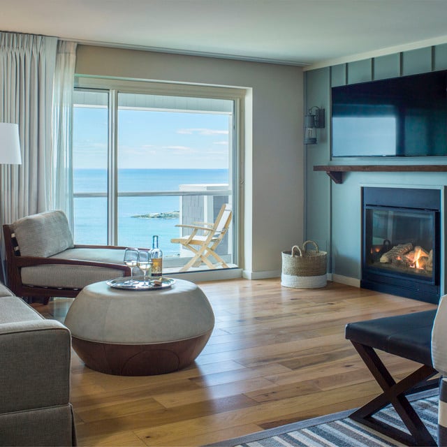 Beautiful spaces with westerly and partial Maine coastal views. Each with a private balcony, fireplace, expansive bathroom and our signature nautically inspired design. These rooms are located in our Clifftop building.