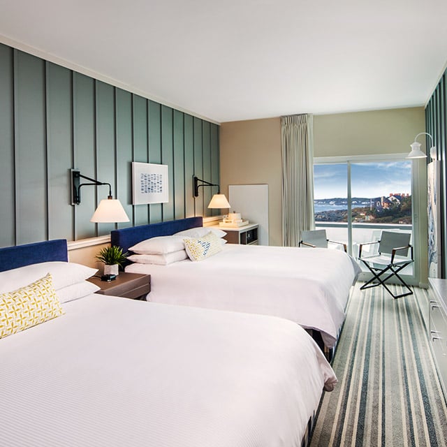 Elegantly simple guest rooms with two king-sized beds, private balconies and views of the Maine coastline.
