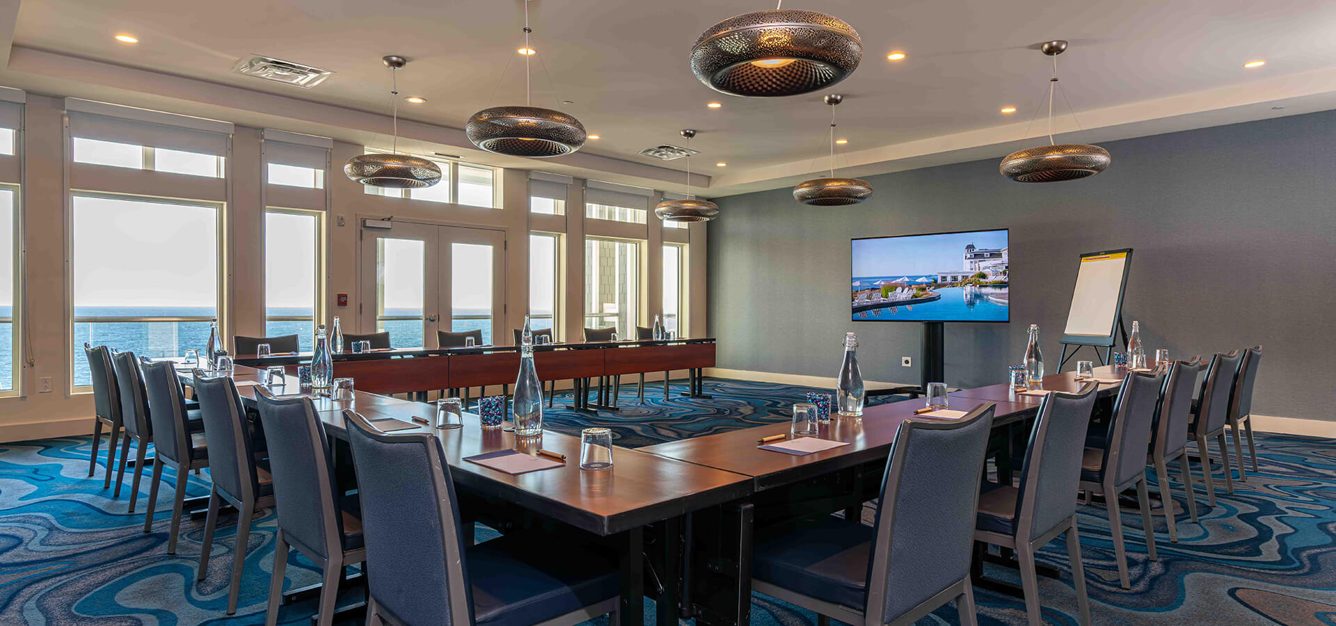 Bald Head Salon offers a refined setting for smaller gatherings, framed by floor-to-ceiling windows that welcome natural light and coastal views. A private balcony extends the experience outdoors, while a built-in marble-topped buffet adds understated elegance. Ideal for executive meetings, private dinners, or small celebrations, it accommodates 10 to 40 guests, depending on setup.