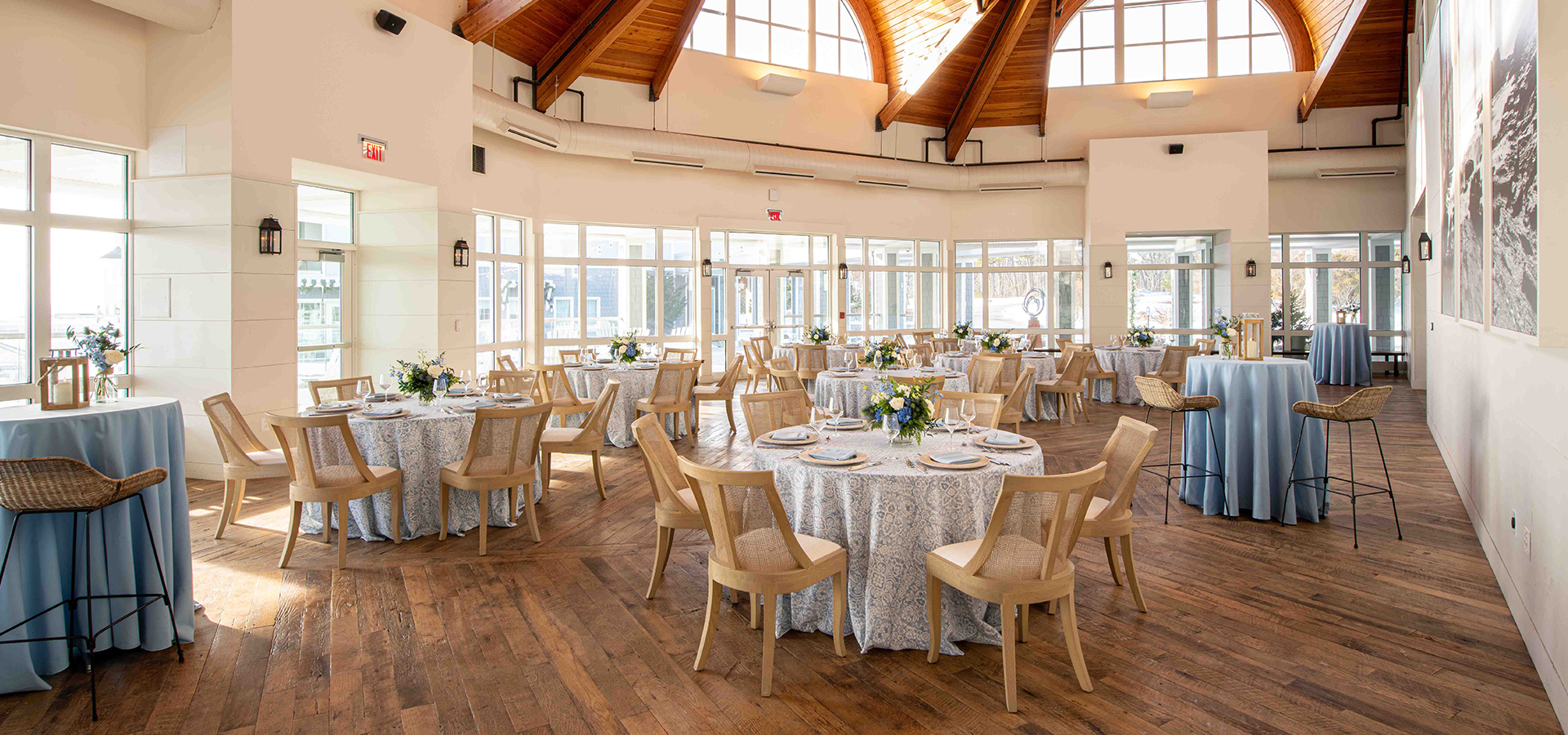 A beautiful event space featuring original wood ceilings and sweeping views of the Atlantic Ocean. The perfect space for a cocktail reception or small group meeting.