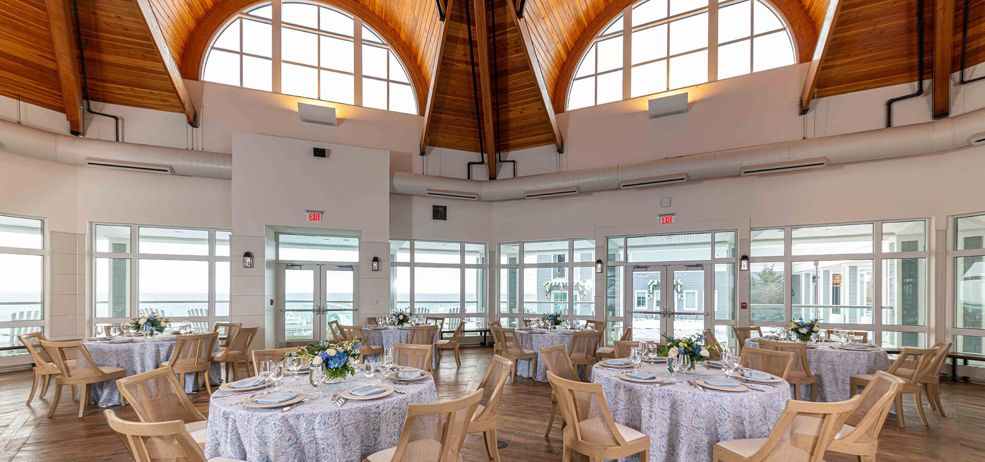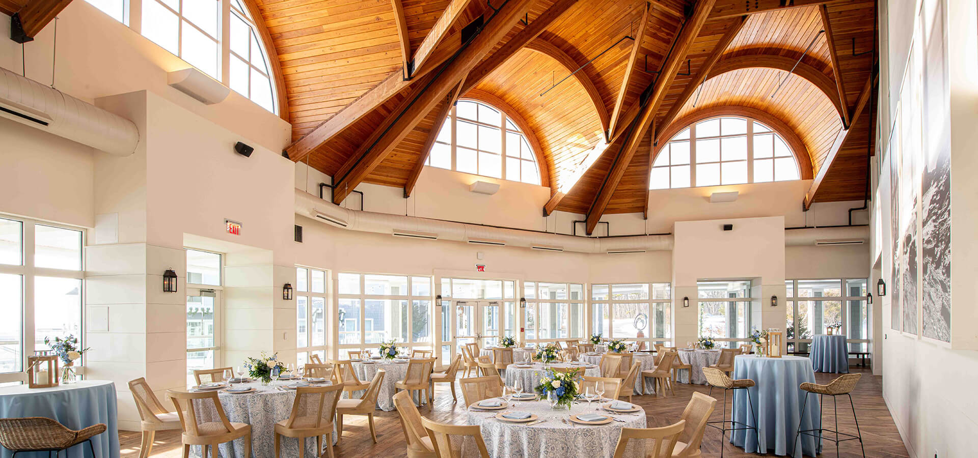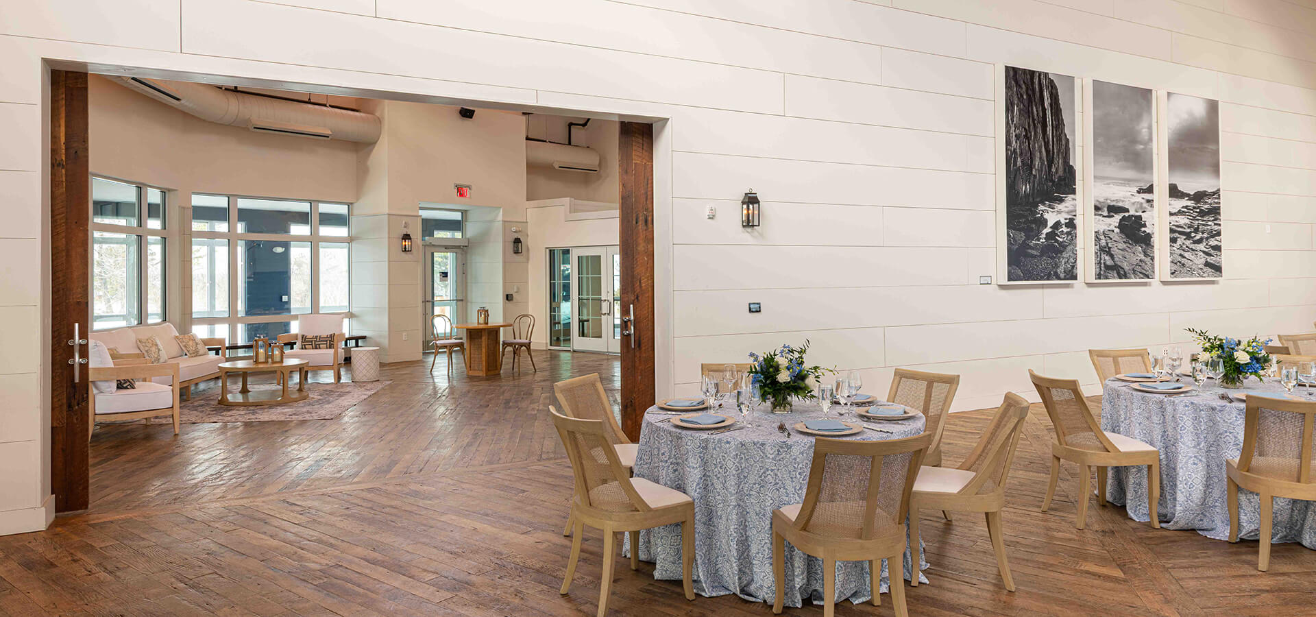 This bright and beautiful +2000 sq. ft. event space is truly like no other. From its lofty vaulted natural wood ceiling, crisp white walls, surround of windows and rustic rough-hewn flooring to the panoramic views out to the terrace and sea, this is more than just a space, it is an experience. This space can be configured in a variety of ways to accommodate cocktail parties and intimate events.